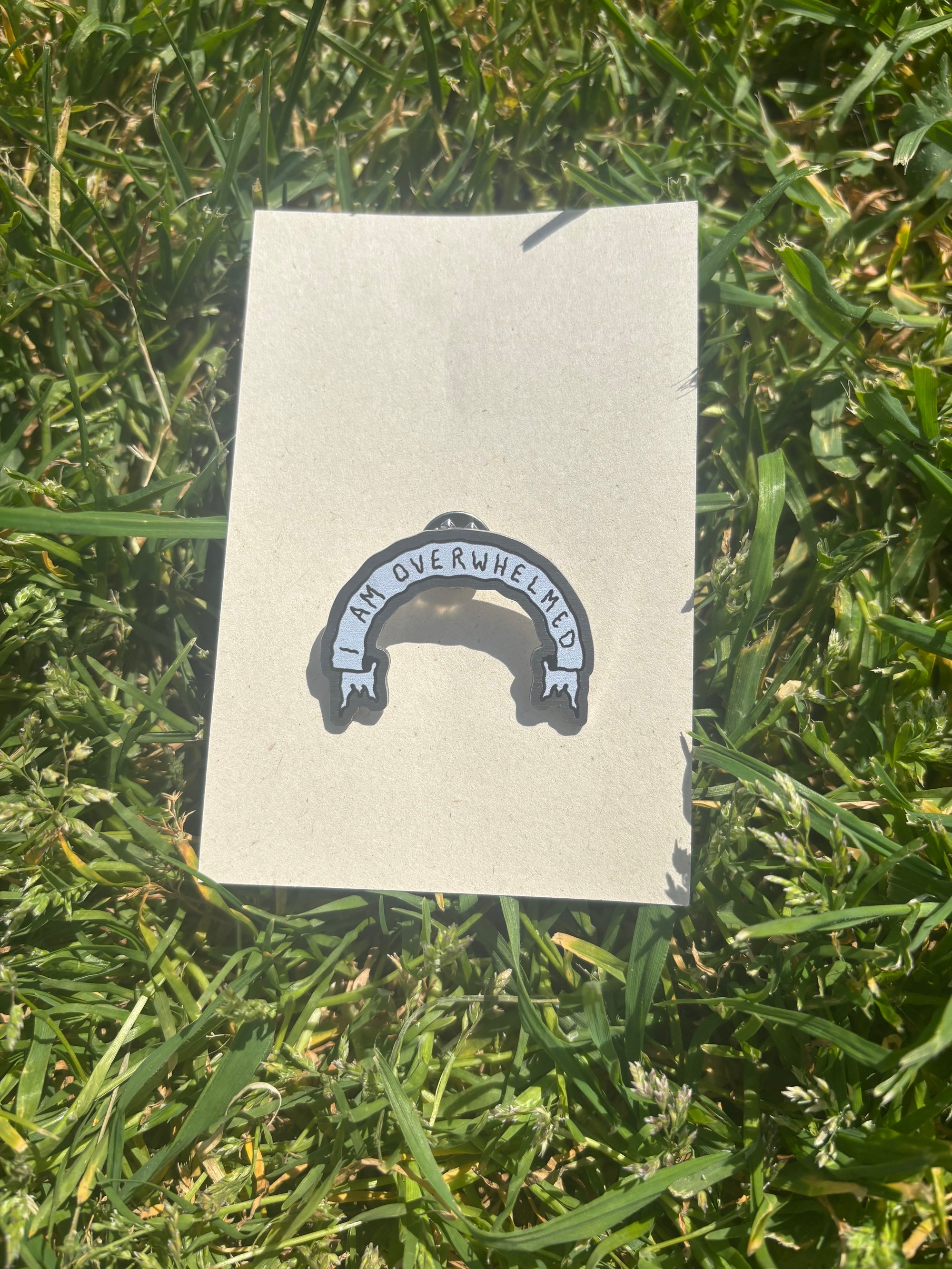 Pin badge reads ‘I am overwhelmed’