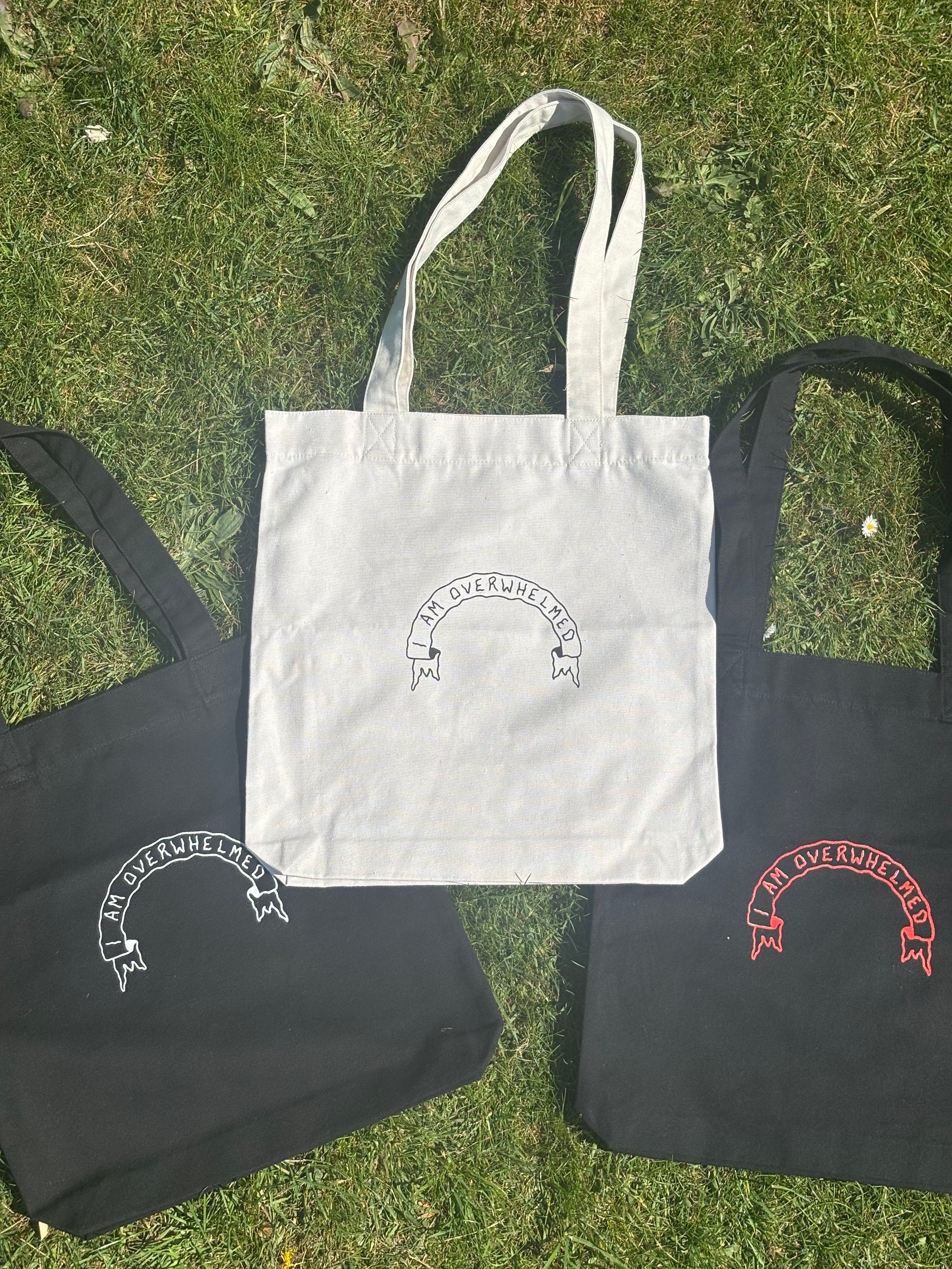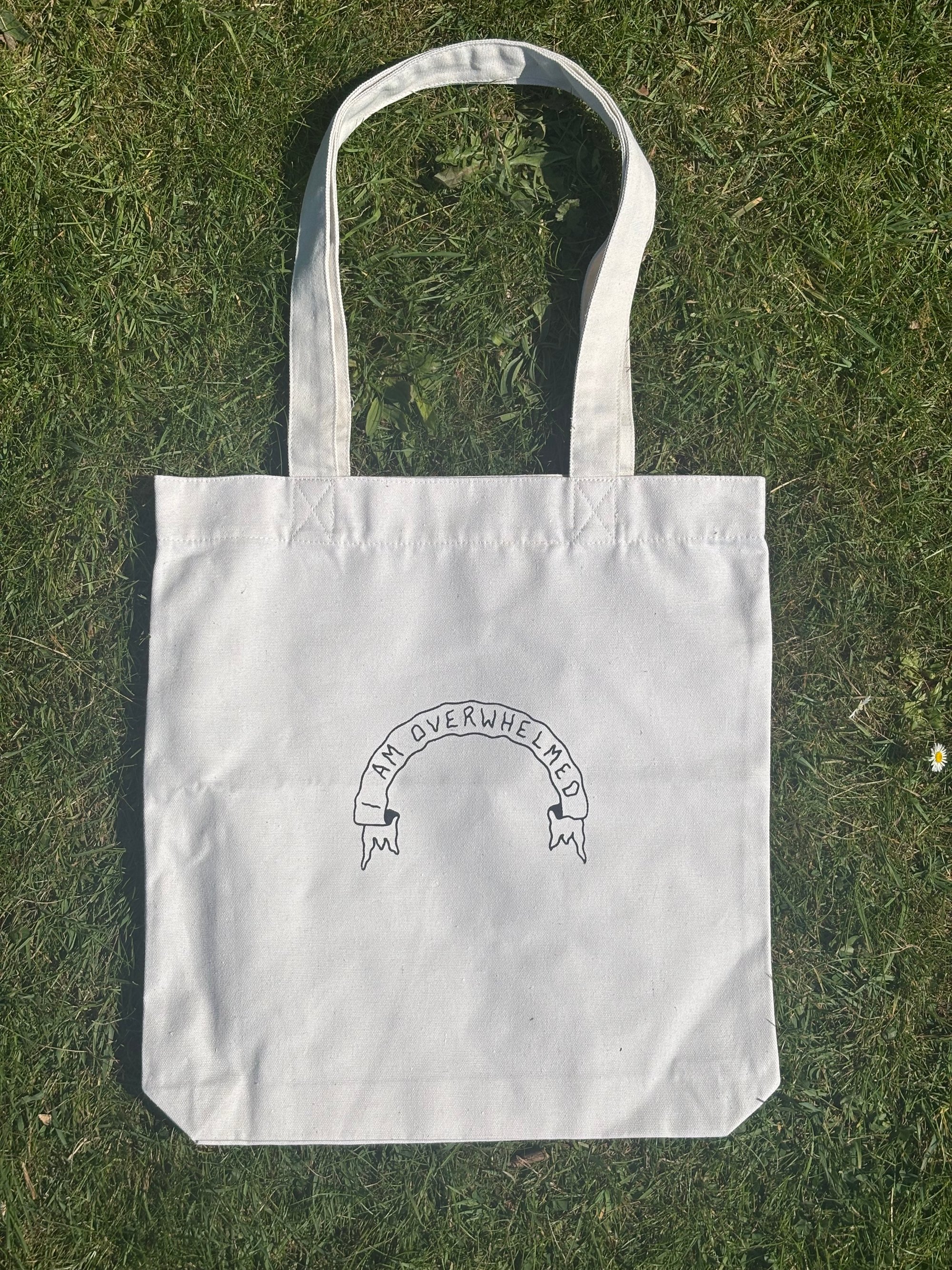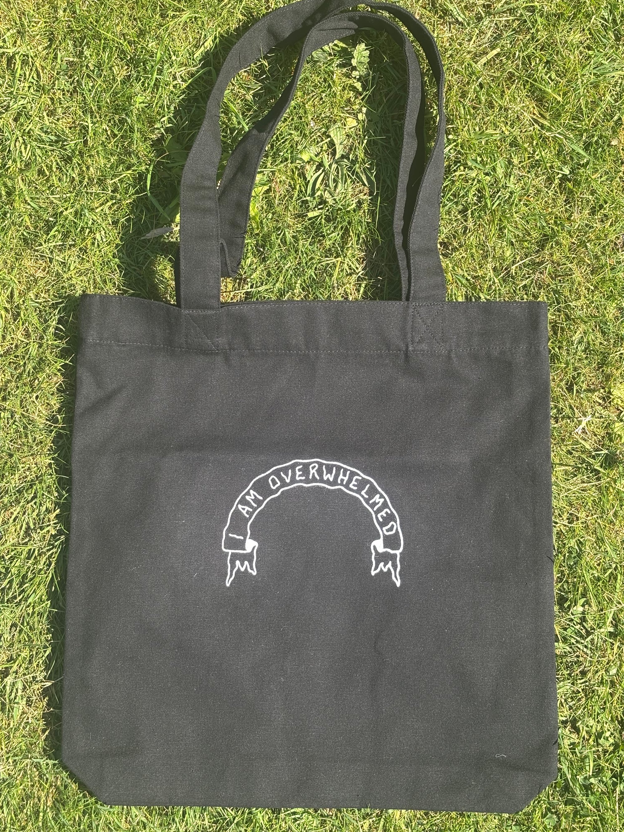 I am overwhelmed screen printed onto heavy canvas tote bag.